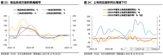 土地供应面积同比增速下行。2023年12月以来(截至12月24日),百城土地供应面积同比增速为-6.26%,成交面积同比增速为-3.05%,溢价率2.89%,较上月上行了0.14个百分点。