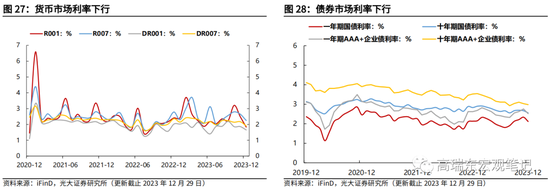 货币市场利率下行、债券市场利率下行。2023年12月以来,R001较上月末下行66bp至1.83%;R007较上月末下行40bp至2.25%;DR001较上月末下行21bp至1.65%;DR007较上月末下行27bp至1.91%。一年期国债利率较上月末下行22bp至2.12%;十年期国债利率较上月末下行11bp至2.56%;一年期AAA+企业债利率较上月末下行24bp至2.52%;十年期AAA+企业债利率较上月末下行5bp至2.98%。