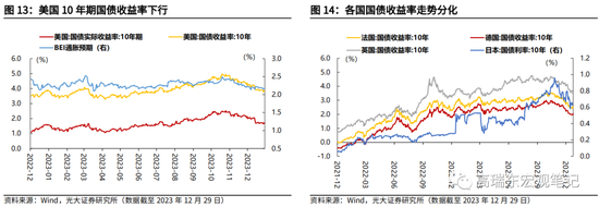 美国10年期国债收益率下行。本周(截至12月29日)美国10年期国债收益率3.88%,较上周末下行2BP,其中通胀预期较上周末下行3BP,实际收益率较上周末上行1BP。法国10年期国债收益率较上周末上行8BP至2.56%,德国10年期国债收益率较上周末上行6BP至2.06%,日本10年期国债收益率较上周末下行3BP至0.62%(截至12月27日),英国10年期国债收益率较上周末下行5BP至3.53%(截至12月27日)。