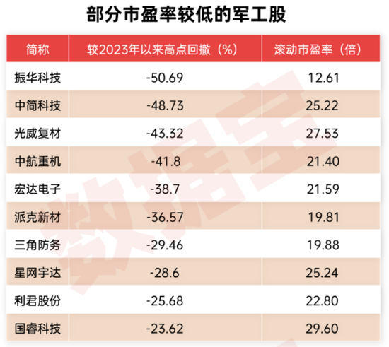 数据宝统计,截至12月29日收盘,国防军工(申万一级行业)指数市盈率为48.44倍,十年来分位点值为0.2%,处于阶段低点位置。13只军工股滚动市盈率低于30倍,包括振华科技、内蒙一机、三角防务、中航重机、中航光电等。
