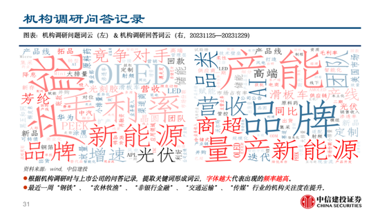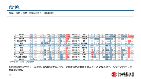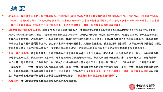 按照自下而上的分析师预期加总,预测2023Q4万得全A和万得全A非金融的ROE为8.08%和7.57%(预测2024Q1分别为7.95%和7.53%);当前A股已经到了历史较低估值水平,且库存周期将带动上市公司整体盈利能力上行,坚定看多未来两年的中国股市。综合中信一级行业多维度指标,2024年01月看好有色金属、电力及公用事业、钢铁、纺织服装和银行的相对收益。