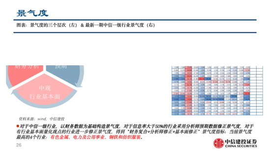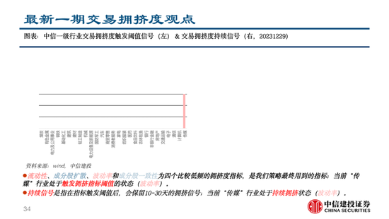 中信一级行业配置:基于财务报表、分析师预期和行业中观数据构建行业景气度指标,有色金属、电力及公用事业、钢铁、纺织服装和银行的景气度比较高。截至2023年12月29号,所有行业的PB分位数都低于50%,行业之间估值分化程度下降。当前机构关注“非银行金融”和“传媒”行业的股票,“石油石化”和“机械”行业的机构关注度从高位下降;最近一周“钢铁”、 “农林牧渔”、“非银行金融”、“交通运输”、“传媒”行业的机构关注度在提升。当前“传媒”行业处于触发拥挤指标阈值的状态,当前“传媒”行业处于持续拥挤状态,近期整体拥挤信号和拥挤行业数量较少。综合多维度,2024年01月看多有色金属、电力及公用事业、钢铁、纺织服装和银行的相对收益;行业轮动策略历史详细业绩信息请关注Wind-PMS组合,“行业轮动相对收益@基本面+量价”。
