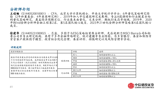王程畅:CFA,北京大学计算机硕士,中南大学统计学学士;6年量化策略研究经验(2年私募基金,4年券商研究所),2019年加入中信建投研究发展部,专注A股择时和行业配置方向的量化策略研究,覆盖经济周期定位、行业基本面量化、文本分析、期权衍生品等领域,2019年、2020年Wind金牌分析师金融工程第2名、第5名团队核心成员,2023年21世纪金牌分析师策略第4名团队核心成员。