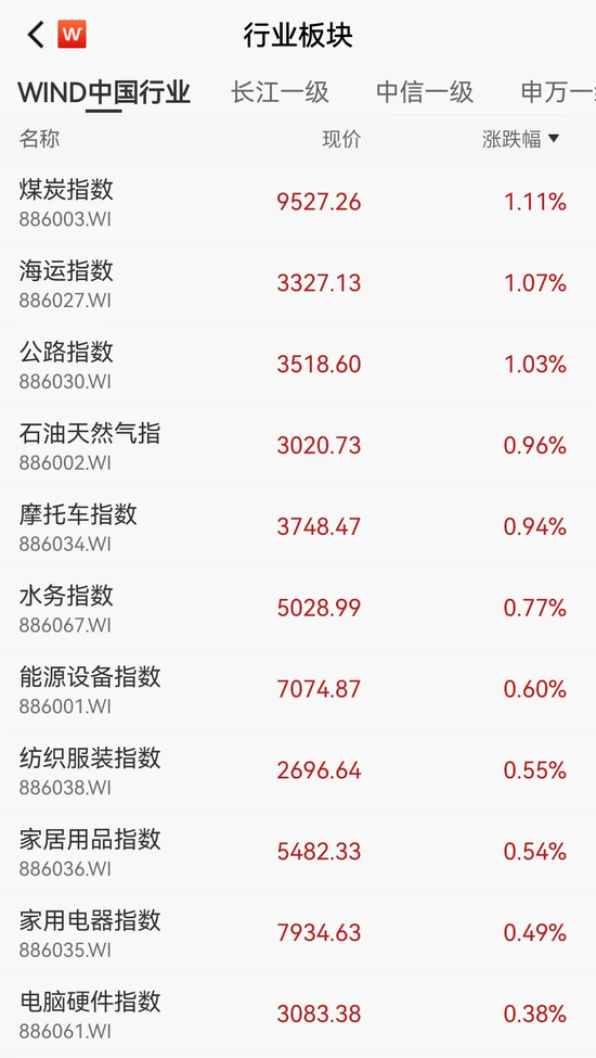 行业板块走势继续分化,其中,煤炭、海运、公路、石油天然气等防御性板块涨幅居前。
