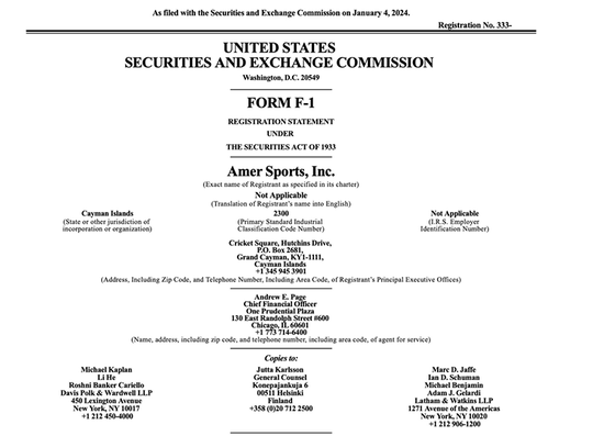 当地时间1月4日,美国证券交易委员会(SEC)官网显示,Amer Sports, Inc.(下称“亚玛芬体育”)已经正式递交F-1文件。按照SEC的规定,F-1文件为注册地不在美国的外国公司招股书。