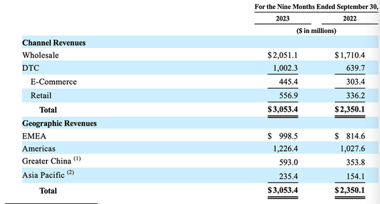 对比来看,2023年前三季度,亚玛芬体育的第一大市场美国贡献营收12.26亿美元,同比增长约19.3%;第二大市场欧洲、中东及非洲贡献营收9.99亿美元,同比增长约22.6%。
