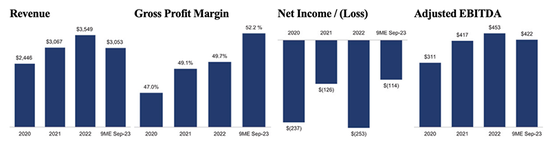 亚玛芬体育提交的F-1文件显示,2020年—2022年以及2023年的前三季度,公司分别实现营收24.46亿美元、30.67亿美元、35.49亿美元和30.53亿美元;毛利率分别为47.0%、49.1%、49.7%和52.2%;净亏损分别为2.37亿美元、1.26亿美元、2.53亿美元和1.14亿美元;调整后EBITDA分别为3.11亿美元、4.17亿美元、4.53亿美元和4.22亿美元。