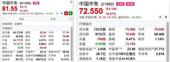 1月9日早盘,中国中免AH股双双大涨,截至发稿,中国中免A股涨超8%,盘中一度涨停;港股中国中免涨超6%。