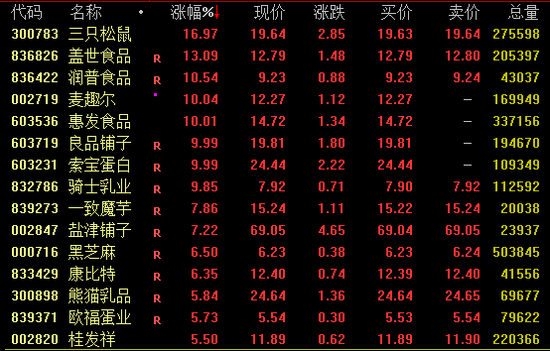 食品饮料板块今日强势拉升,截至收盘,三只松鼠涨约17%,盖世食品涨超13%,麦趣尔、惠发食品、良品铺子、索宝蛋白等涨停,盐津铺子涨逾7%。