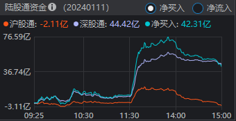 北向资金全天净买入42.31亿,其中沪股通净卖出2.11亿元,深股通净买入44.42亿元。
