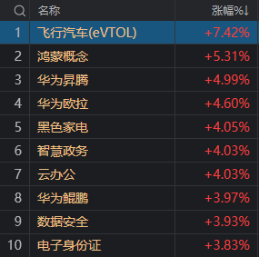 板块方面,飞行汽车、鸿蒙概念、算力租赁、锂矿等板块涨幅居前,供销社、煤炭、旅游等板块跌幅居前。