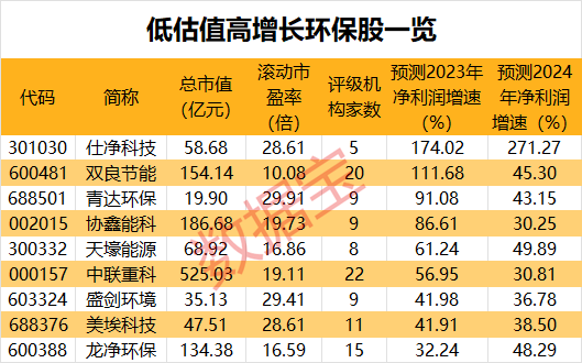 在上述低估值概念股中,根据5家及以上机构一致预测,仕净科技、双良节能、青达环保、协鑫能科和天壕能源等9股2023年和2024年两年净利增速均超30%。