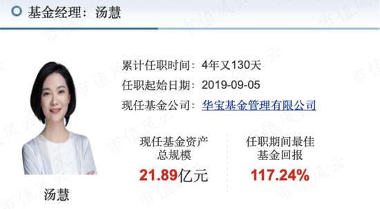 这只基金由华宝基金的汤慧管理,她目前管理的规模不大,仅20亿出头,任职期间最佳基金回报为117.2%,但其实这个亮眼成绩是她在2019-21年市场环境较好下积累的。