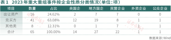 在2023年已完成的重大重组事件中,属于中央国有企业性质的重组有14项,属于地方国有企业性质的有27项,涉及国企的重大重组合计41项,占重大资产重组完成量的63.08%。相比之下,民营企业性质的重组有22项,外资企业和公众企业各有1项,民营企业及其他类型企业完成重大资产重组的数量合计占比不足四成。
