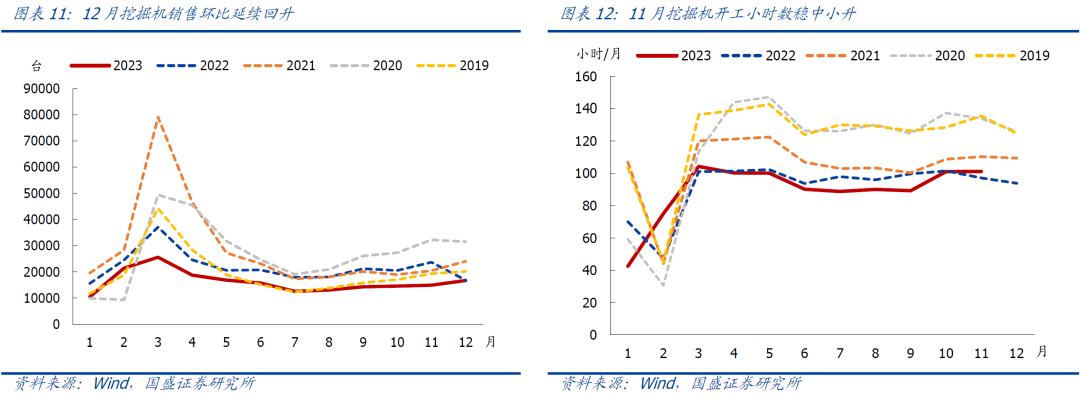 挖掘机销售环比延续回升,其中:内销仍弱;使用时长小幅回升、但仍在低位。2023年12月挖掘机销量环比续升11.9%至1.67万台,主因季节性影响,绝对值仍为近年同期最低;相比2022年和2019年同期分别偏低约1.0%、17.2%;其中,国内销售7625台,环比11月增加1.9%,相比2022年同期增加约24.0%。11月挖掘机平均开工时长小升0.2小时至101.2小时/月,相比2022年同期偏高约4.0小时/月、但相比2019年同期仍偏低约34.3小时/月。