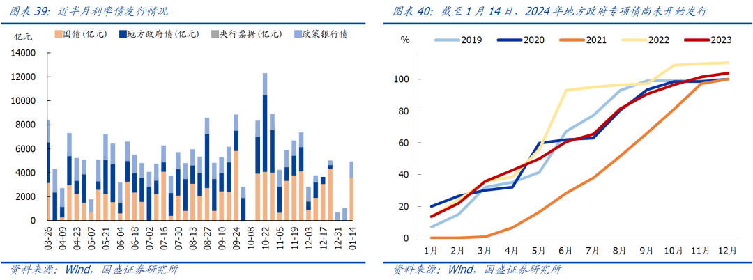 >货币市场流动性:跨年之后,央行OMO集中到期,流动性回笼较多。近半月净回笼26120亿元。货币市场利率明显回落。近半月DR007、R007、Shibor(1周)均值分别回落63.5bp、3.4bp、1.4bp。同业存单利率续降,3月期AAA、AA+同业存单到期收益率同步回落19.5bp。