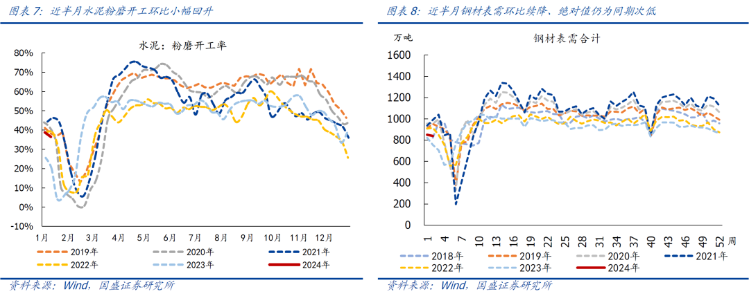 水泥粉磨开工小幅反弹,钢材表需续降。近半月来,水泥粉磨开工率环比回升1.6个百分点至37.6%,节奏上先升后降;相比2023年同期偏高约14.9个百分点、但相比2019年同期偏低约2.0个百分点。钢材表需环比续降3.5%至约845.6万吨,仍为近年同期次低,相比2023年同期偏高7.1%、但相比2019年同期偏低约11.6%。