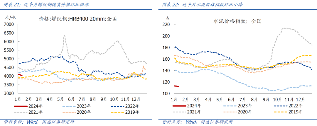 >中游工业品:钢铁价格环比微涨,水泥价格小降。近半月来,螺纹钢现货价格中枢微涨0.1%,同比偏低3.7%;水泥价格中枢环比小降0.4%,同比仍偏低19.2%,降幅延续收窄。
