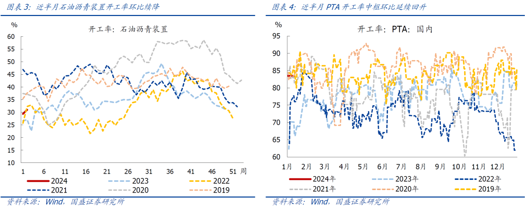 中上游开工延续分化,其中焦化、PTA开工率有所回升。近半月来,全国247家样本高炉开工率环比续降0.6个百分点至75.9%,相比2023年、2019年同期分别偏高0.7、1.0个百分点。焦化企业开工率环比回升1.3个百分点至69.6%,相比2023年同期偏高3.2个百分点、但相比2019年同期仍偏低约4.5个百分点。石油沥青装置开工率环比续降1.6个百分点至30.2%,相比2023年同期偏高约3.4个百分点、但相比2019年同期偏低约6.3个百分点。PTA开工率均值环比延续回升2.2个百分点至83.5%,相比2023年同期偏高约15.3个百分点、但相比2019年同期仍偏低约1.3个百分点。