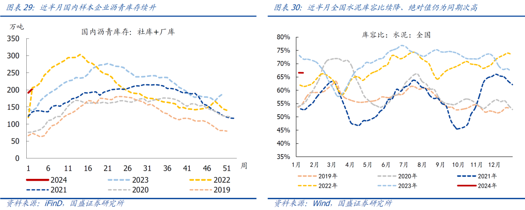 沥青库存续升,水泥库存续降、绝对值仍为同期次高。近半月来,沥青库存(厂库+社库)环比续升18.5万吨至202.9万吨,仍在近年同期偏高水平,相比2023年同期偏高约64.0万吨,差距进一步扩大。水泥库容比环比续降1.0个百分点至66.6%,仍为同期次高(仅次于2023年同期);相比2023年同期偏低约5.8个百分点。