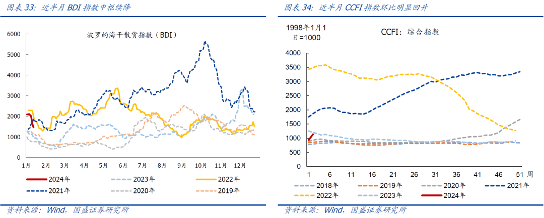 出口运价:BDI指数续降,CCFI指数环比明显回升。近半月来,波罗的海干散货指数(BDI)环比回落13.1%,相比2023年同期偏高约71.2%。中国出口集装箱运价指数(CCFI)环比回升16.1%,可能跟红海冲突等因素有关;相比2023年同期仍偏低约15.5%,降幅进一步收窄。