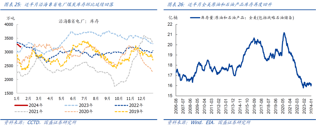 电煤库存延续回落、绝对仍为同期次高;全美石油库存再度回升。近半月来,沿海8省电厂存煤均值3251.4万吨,续创同期次高(略低于2022年同期),环比减少3.4%,相比2023年和2019年同期分别偏高约7.9%、18.1%。截至2024年1月5日,全美原油及石油产品库存再度回升,相比前值增加约1809.2万桶。