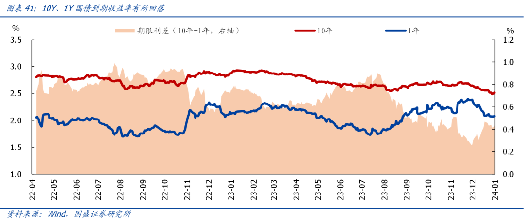 二级市场:近半月来,10Y、1Y国债到期收益率分别回落6.8bp、14.5bp至2.515%、2.080%,期限利差扩大7.6bp至约43.5bp。其中:10Y国债收益率跌破2.5%,最低降至2.486%(1月9日)。