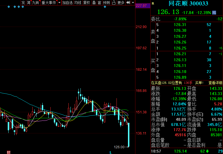 1月16日,同花顺大跌,截至发稿,股价报126.13元,跌超12%,创10个月新低,成交量超17亿元。