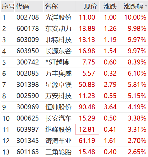 汽车板块上午直线拉升,光洋股份、东安动力、长源东谷、北特科技(维权)等多股涨停,千亿市值的长安汽车、潍柴动力均有明显涨幅。
