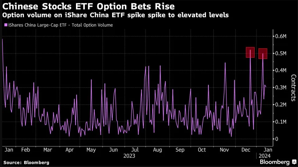 一组数据显示,上周三,挂钩追踪港交所中国大盘股的美国上市ETF——iShares China Large-Cap ETF的期权总成交量飙升至了近50万份合约,这是不到一个月来第二次达到这一高水平。当日,看涨期权的交易量是看跌期权交易量的两倍多。