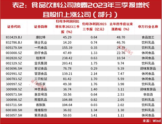 此外,2023年四季度以来,在指数承压调整的市场环境下,康比特、骑士乳业、一鸣食品等多家2023年三季报绩优股也迎来了股价上涨(见表2)。