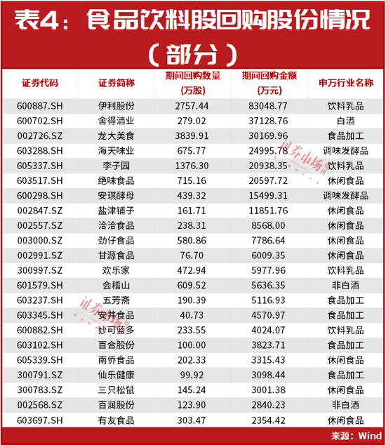 据不完全统计显示,2023年以来,有46家食品饮料股有回购行为,累计回购金额约为33亿元。进一步来看,除了上述提及的李子园、绝味食品,伊利股份、舍得酒业、龙大美食、海天味业等回购金额同样较高,均超过亿元。此外,洽洽食品、劲仔食品、甘源食品、欢乐家、会稽山等回购金额均超过5000万元(见表4)。