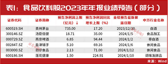 与此同时,上市公司的年报预告也在密集披露。据不完全统计显示,截至目前(1月15日),市场已有逾150家公司披露2023年年报业绩预告。其中,食品饮料(主要包括食品加工、白酒、非白酒、饮料乳品、休闲食品、调味发酵品)多家公司上榜,整体表现“抢镜”,其中既有以735亿的预期盈利额高居当前A股盈利首位的贵州茅台,也有发布业绩预增达数倍的莲花健康等。