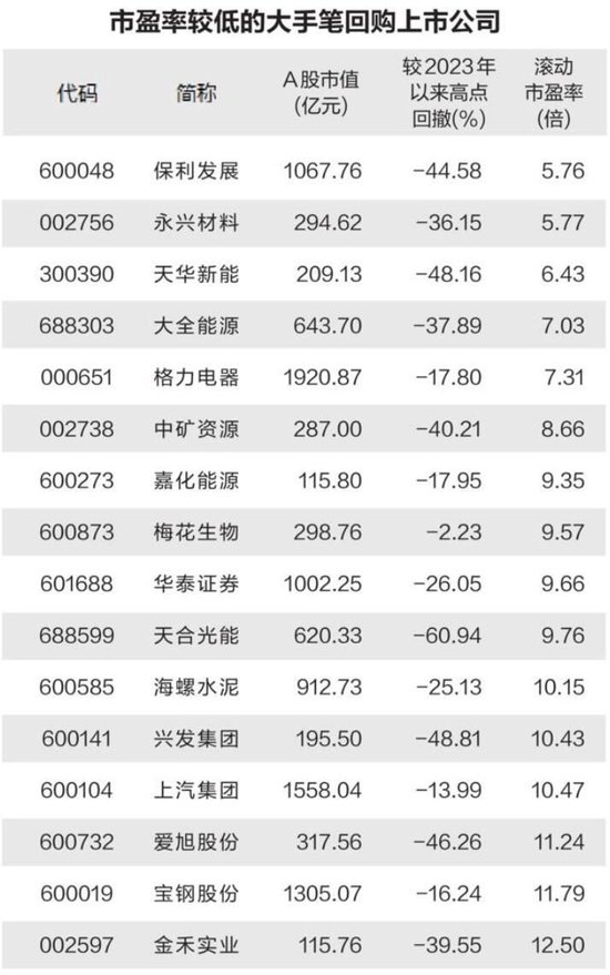 数据宝统计,上述80家回购超1亿元的公司中,截至1月16日收盘,保利发展、永兴材料、天华新能、大全能源、格力电器等10家公司滚动市盈率低于10倍。永兴材料滚动市盈率5.77倍,公司目前主要从事锂电新能源、特钢新材料两大业务,2023年前三季度实现净利润30.53亿元。