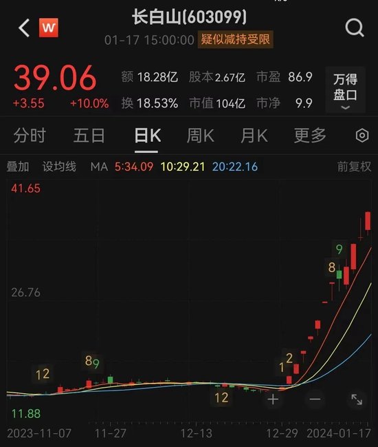 1月17日,长白山股价收于39.06元,再创上市以来新高,市值超过104亿元。1月17日晚,长白山发布股票交易严重异常波动公告,公告提到,公司股票于1月15日、1月16日、1月17日连续三个交易日内日收盘价格涨幅偏离值累计达 20%。