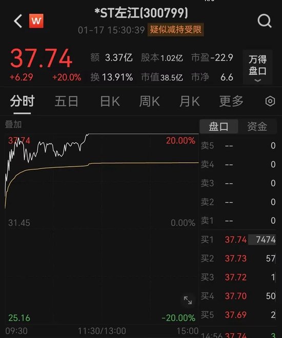 *ST左江(300799)1月17日晚发布异动公告提示风险。1月15日至1月17日,*ST左江连续3个交易日20%涨停,累计涨幅超过72%。