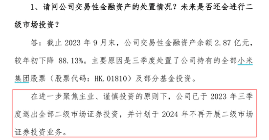 在日前的投资者调研会议上,云南白药表示,2023年第三季度已处置了公司持有的全部小米集团股票及部分基金投资。截至2023年9月末,公司交易性金融资产余额2.87亿元,较年初下降88.13%。