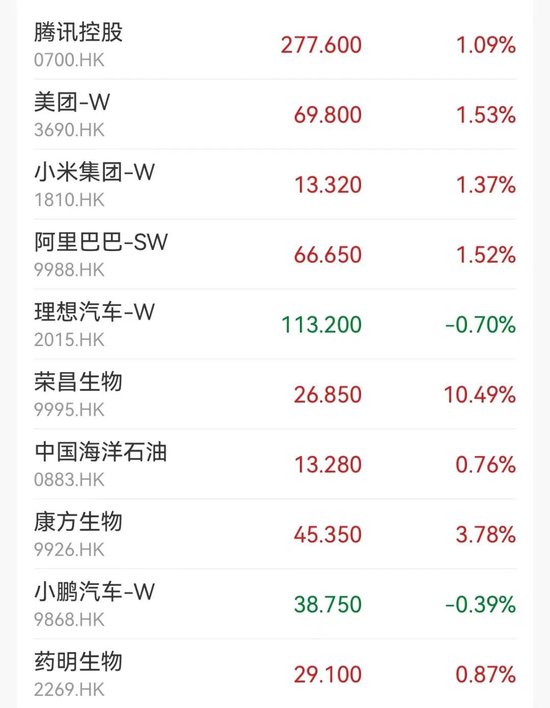 盘面上,大型科技股拉升,带动大盘反弹,百度涨3%,网易、小米、腾讯、阿里巴巴涨超1%;光伏股领涨,福莱特玻璃涨超6%;海运股齐涨,海丰国际涨5.71%,东方海外国际涨超5%;旅游股活跃,中国中免涨超4%;医药股集体走强,荣昌生物涨超10%,康方生物涨近4%。