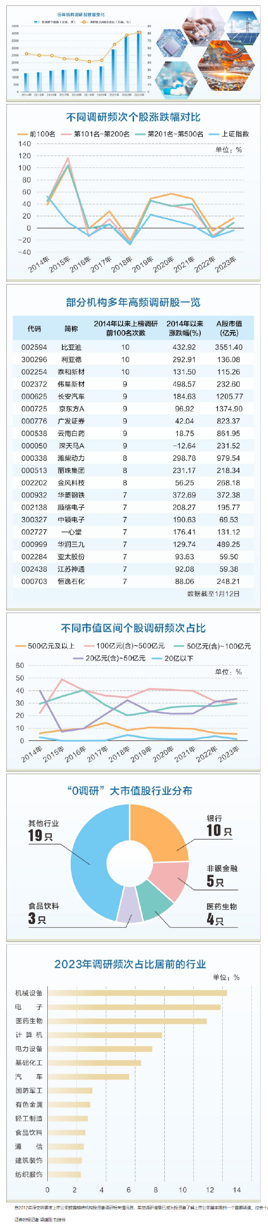 分行业来看,近十年来,机构调研股主要集中在五大行业,包括机械设备、电子、医药生物、计算机、电力设备。2023年,这五大行业调研频次占比合计50.06%;其他还有基础化工、汽车,占比超过5%,可以看出机构调研主要关注成长潜力大的战略性新兴产业。
