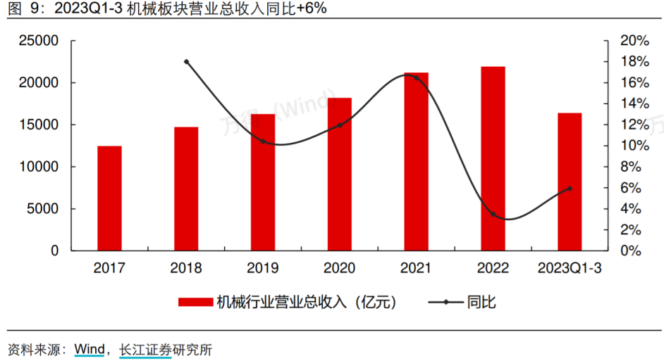 不过根据长江证券研究所统计,2022年机械行业板块营收同比+3.5%,增速大幅回落;2023Q1—Q3机械行业实现营业总收入16407亿元,同比+5.9%,板块增速边际改善,机械板块最悲观的时候可能已经过去。