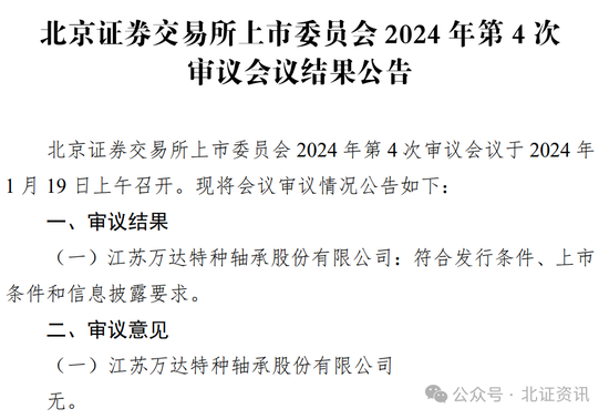 根据北交所上市委2024年第4次审议会议结果,万达轴承符合发行条件、上市条件和信息披露要求。公司成为最快过会的新三板企业,再度刷新“北交所速度”。
