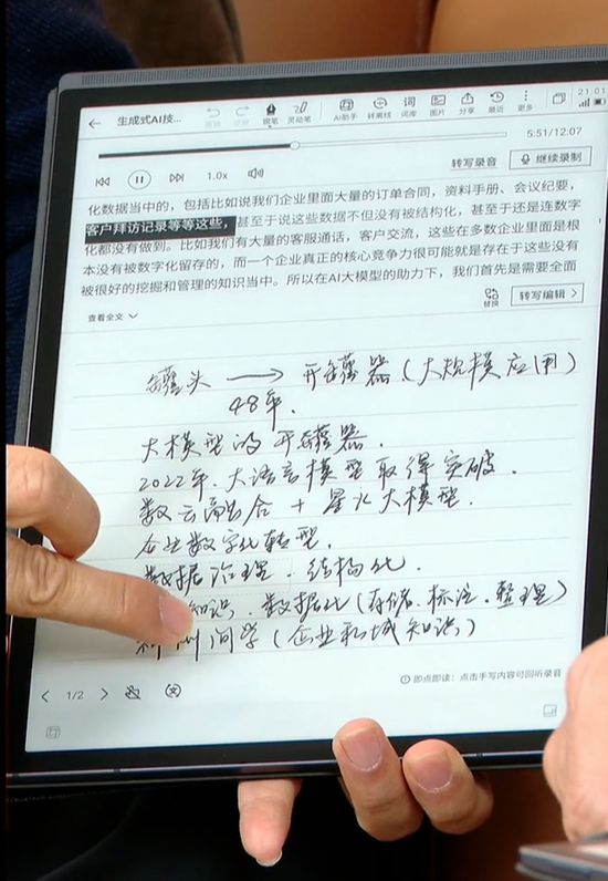 节目中俞敏洪体验的另一个讯飞“爆款”,是讯飞办公本。在星火大模型加持下,讯飞办公本实现了智能语音转写、会议纪要生成以及日程提醒等功能,刘庆峰现场进行了功能演示。