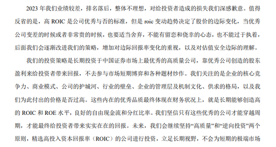 嘉实核心蓝筹混合的基金经理肖觅也在四季报中写了满满三页纸,“小作文”近3500字。他表示,2023年其在快递行业的竞争格局判断、房地产政策和需求的互动两个方面的判断上都有明显失分的地方,持仓的主要上市公司都经历了显著的估值收缩,组合表现不佳,创出了成立了以来的最大回撤,“在此向各位信任我们的持有人表示抱歉。未来我们还是希望能够通过自己在个股alpha方面的努力,结合一些组合管理的方法,尽可能去改善不利情况下的回撤,在实践中让我们的低波动权益投资框架实现应有的效果。”