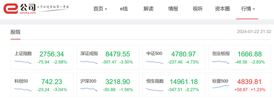 1月22日,沪深两市股指单边下行,个股普跌;三大指数午后均创阶段新低。截至收盘,沪指跌2.68%报2756.34点,深证成指跌3.5%,创业板指跌2.83%,两市超5000只个股下跌,总成交额近8000亿元。港股方面,香港恒生指数收跌2.27%,恒生科技指数跌3.02%。
