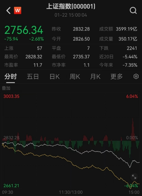 1月22日,A股三大指数低开低走,午后加速下探。截至收盘,沪指跌2.68%,报2756.34点;深证成指跌3.5%,报8479.55点;创业板指跌2.83%,报1666.88点。此外,沪深300指数收跌1.56%,北证50指数跌4.3%,科创50指数跌3.04%。