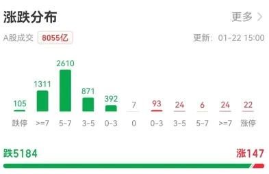 个股层面,全市场下跌个股多达5184只,上涨个股仅147只,跌停个股达105只,涨停个股22只。