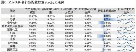 从公募基金持仓角度看,医药是截至目前2023年四季报中披露配置权重最高的行业,配置权重为14.81%,在四季度有所增仓。医药近期随大盘下行再次调整,虽然市场情绪很弱,但国内老龄化加速下,医药板块需求充足的基本面不变。另外,创新崛起下不断有新技术和新产品供给,叠加医保费用整体持续增长,中长期医药行情仍值得期待。从中期角度,创新、出海和中药等方向仍为投资主线,医药板块当前配置价值较高。