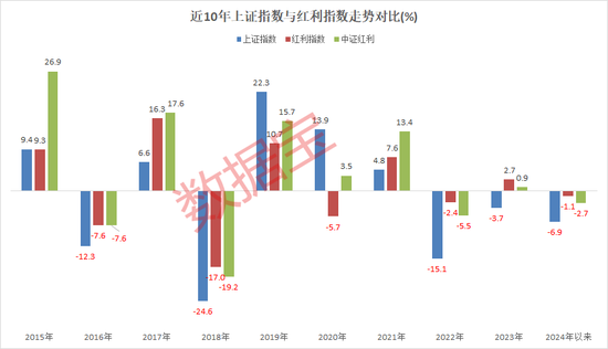 从指数表现来看,2024年以来,上证红利指数累计跌幅1.1%,中证红利指数累计跌幅2.7%,虽然均为下跌,但表现仍远远好于同期上证指数(跌幅6.86%)。将时间线拉长,在2015年~2024年的近10年中,除去2019年、2020年市场涨幅巨大的年份,其余年份红利指数表现均优于上证指数。