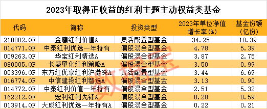 基金市场方面,2023年,多只锚定红利指数的主动权益类基金获得正收益。其中,金鹰红利价值A单位净值增长率居首,高达34.25%;第二、第三位分别是中泰红利优选一年持有和华宝红利精选A,单位净值增长率依次为4.78%、3.87%。