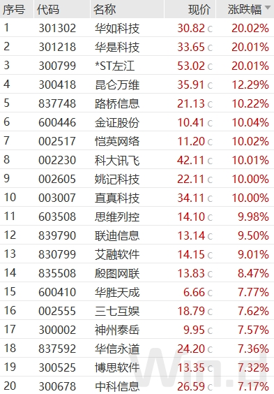 从涨幅居首的软件与服务板块个股表现来看,华如科技、华是科技、昆仑万维、金证股份、恺英网络、科大讯飞、姚记科技、直真科技、思维列控等多股涨停或涨幅超10%,华胜天成、三七互娱(维权)、神州泰岳、博思软件、中科信息等个股亦大幅拉升。